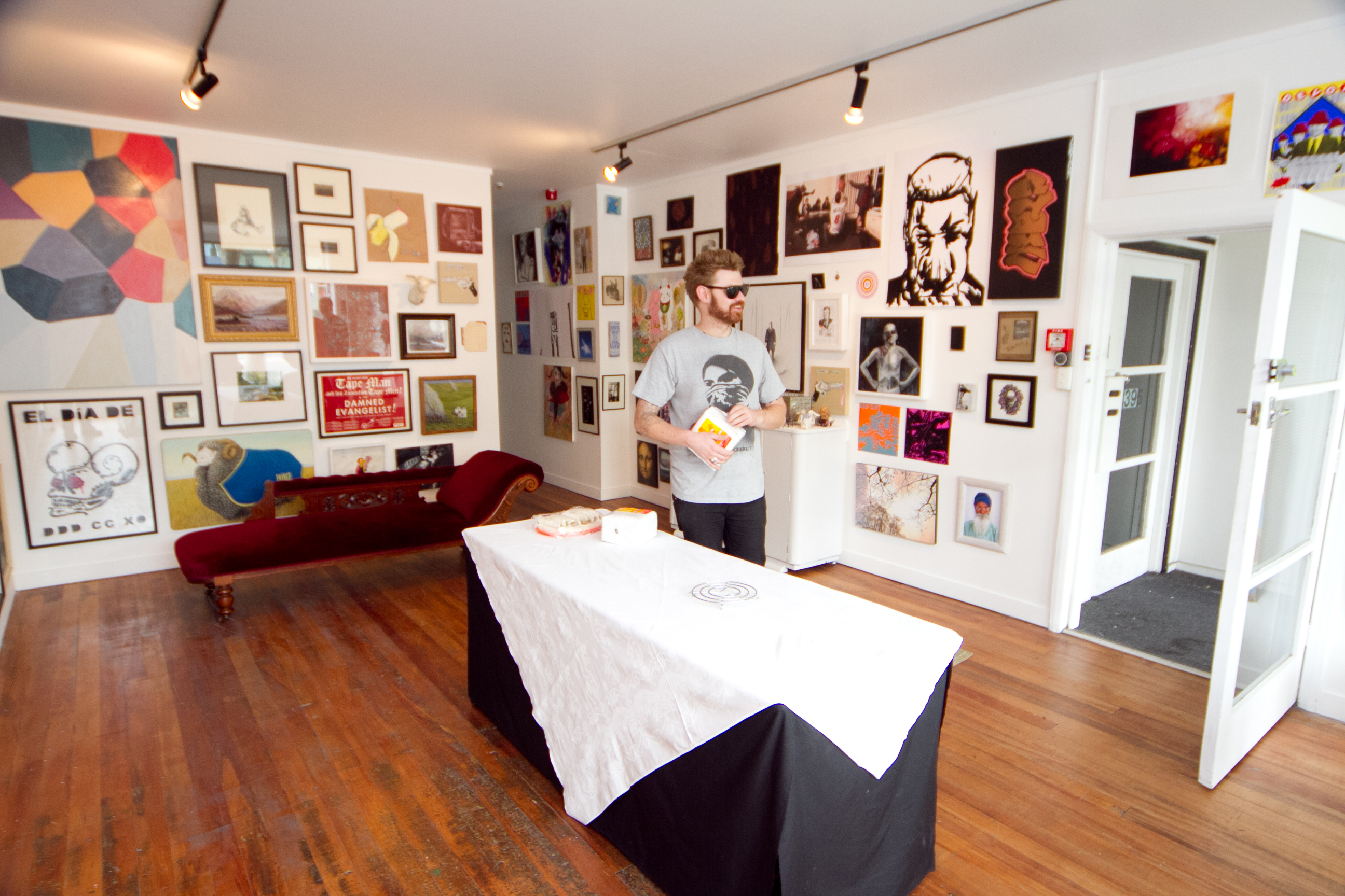 Conceived as a two-year project, ‘a gallery’ opened in February 2011 at 393 Princes Street, Dunedin and closed in September 2012. Strategically placed south of the center of town nestled between tattoo studios, sex shops and a needle exchange. What was integral in the selection of the gallery space was that it would be able to be viewed from the street through the street level floor to ceiling windows. This would allow the artists showing to be exposed not only to viewers visiting the gallery, but also those walking past, as a gallery was to represent artists that did not fit within the commercial gallery context or the so called experimental project space’s, this would be the best way to expose a particular group of artists selected by gallery curator/manager Jay Hutchinson, artists he respected and admired and felt were not being represented in the gallery scene at the time.