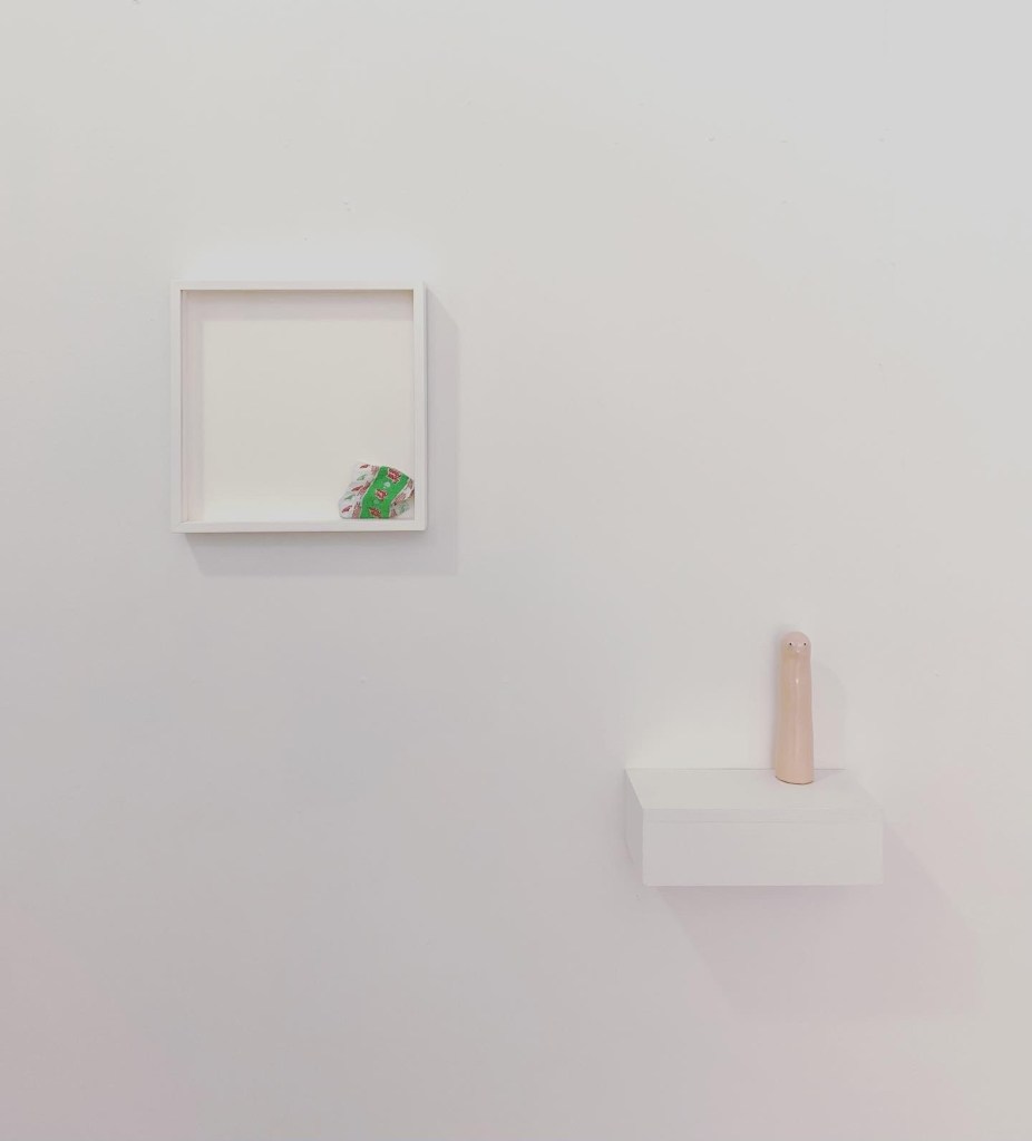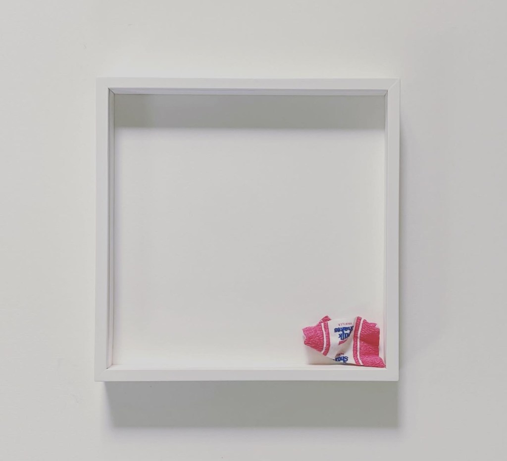 Exhibited among this melange of troubled and cheerfully perverse characters are Hutchinson’s embroidered works in clear frames. Perhaps there are less Jimmy’s pie bags around at this time of the year, as Hutchinson has shifted his focus to lolly wrappers (Fruit Bursts and Milkshakes), a Rashuns bag, and the ultimate hint of summer, a Fruju wrapper. Insert summer jingle and check it out.