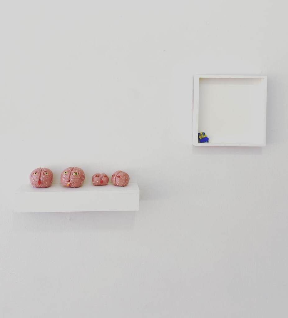 Brains with faces, flawed families, smoking dogs, self-portraits, and Liz (Queen Elizabeth II), the Rayner Brothers are back for another outing at Olga with their slightly outre ceramics. This time the “Circus” features Otepoti Dunedin-based artist Jay Hutchinson’s well-known embroidered works of found rubbish (screen-printed on to fabric and embroidered).