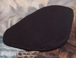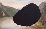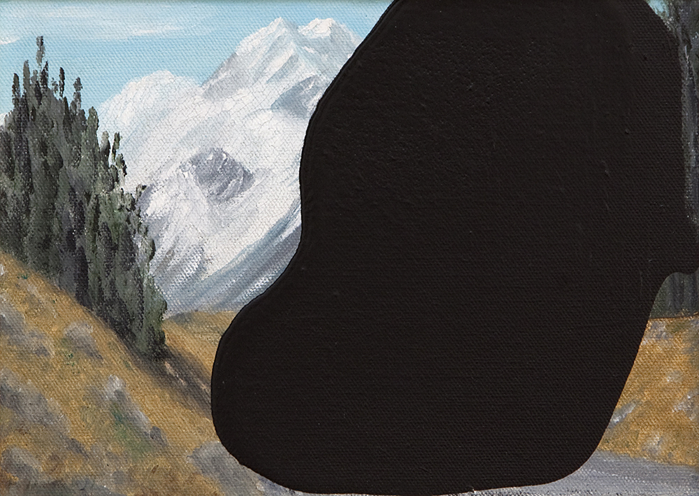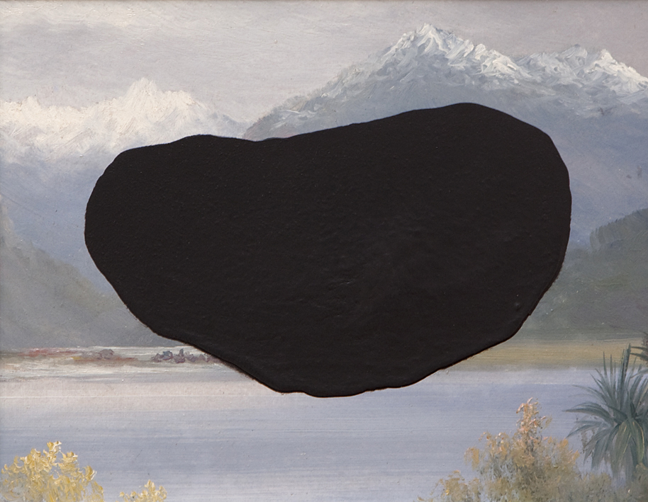 The black paint was directly poured onto certain works, like untitled (flower painting), so that it blended with the original work and created an even surface. For others, like Tukituki River and the Craggy Ranges (Hawke’s Bay), Kennedy made the black patches first by pouring house paint onto sheets of glass. The patches were then laid onto the surfaces of the found objects. Apparently, they will peel off the paintings and retain their substance, an idea I found quite appealing as I imagined the artist taking the work further, using other objects in conjunction with these thick, tactile additions. These works oddly attain a sculptural presence, as the fabricated holes, like artist Carl Andre’s, are in no sense voids. They ooze out of the original works, or they retreat into them, digging and filling simultaneously.
