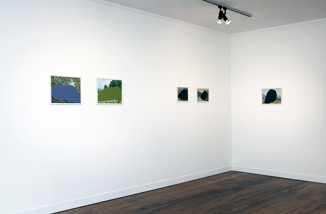 An exhibition of seemingly conventional, uniform landscape paintings is an unexpected site at A Gallery. However, the ideas behind the work of Alexandra Kennedy easily explain the place of New Voids here. Kennedy spent nine months hunting through secondhand shops and garage sales for old paintings. One is a still life – the only hint is in the title, untitled (flower painting) – and the rest are landscapes. She has painted black ‘voids’ onto the surface of each, except for untitled (river and bush) and untitled (river and bridge), whose voids are blue and green respectively.