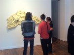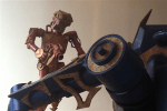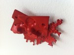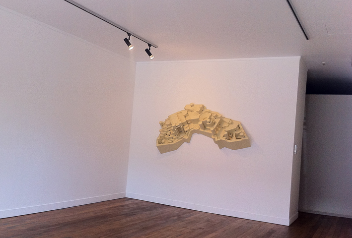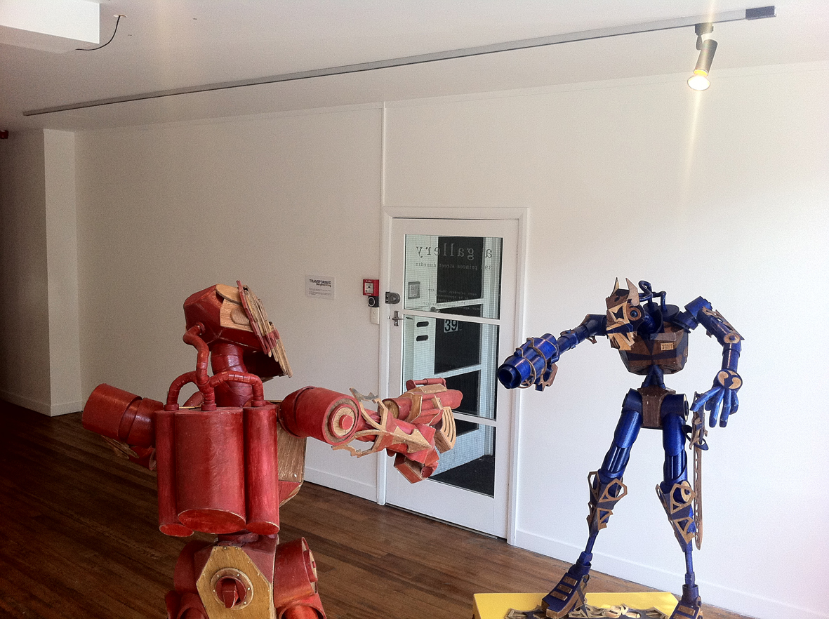 The title of Benjamin King’s exhibition at A Gallery carries multiple layers of meaning. On the purely prosaic level, “Transformed” refers to the recycled material used by the artist for his art. The title also refers more spiritually to the biblical themes touched on in the exhibition, and the eternal conflict between the soul and the flesh. Transformation is also key to the artist’s inspiration – a specific biblical passage in which Jacob wrestles with a mysterious figure, after which his name was changed to Israel. On a more playful level, the title has further meaning – the science-fictional figures which the artist has created are strongly reminiscent of the “Transformer” toys which convert from one form to another. In King’s works, two giant figures stand opposed ready to lock together in battle. The wooden figures are luridly coloured steampunk robots whose forms were inspired by an old tabletop wrestling game, and they have been well crafted with humour and attention to detail. A third sculpture hangs on a wall nearby. Created from card coated in sand, it shows a meticulous aerial fly-by of Jerusalem, yet in the company of the two robots it appears almost as a science-fictional space battle-cruiser. Again, the attention to detail makes this a very attractive work.