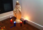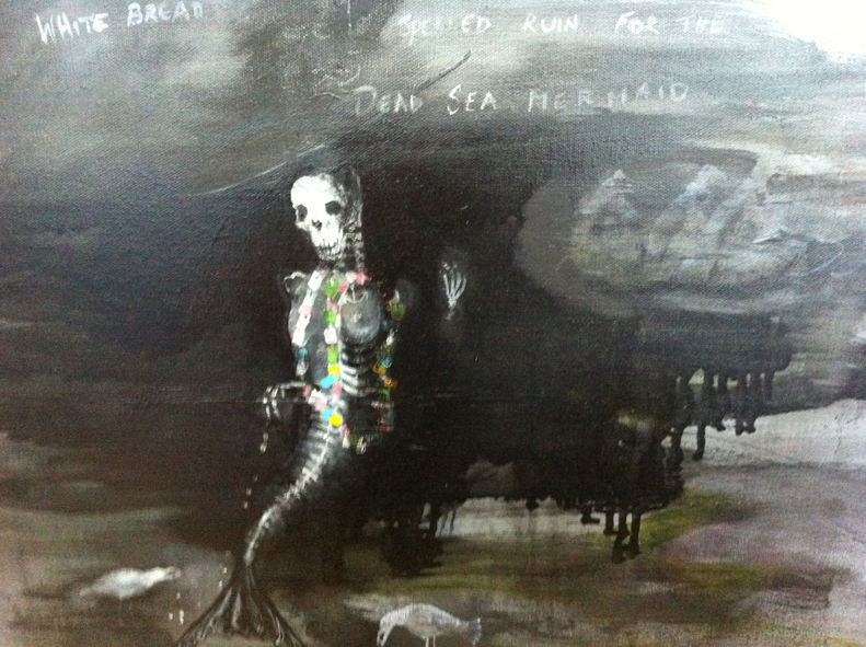 The insidious presence of death is further explored in Dead Sea Mermaid, one of the two works in this show which is occupied by human or humanlike figures. The serpentine skeletal form of the mermaid is draped in colourful Mardi Gras beads, dutifully earned given the figure’s ghostly outline of breasts. By contrast the work Prey which hangs on the adjacent wall, features the Virgin Mary running a rosary of skulls through her hands, her blue robes blending into the surrounding imagery. This work is further populated by a combination of old and new, reality and make-believe. In this world a rather startled looking anthropomorphised hot air balloon, a lonely moa and a modern day boat, all become part of the same mythology. These elements collectively offer the viewer an impression of playfulness that is engaging but which also generates a sense of unease. This combination of gravity and celebration resonates throughout Soil, and provides an interesting premise for willing viewers to follow through the exhibition.