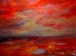 In two of her Postcard series Singer uses a predominantly ochre and charcoal palette, creating landscapes that seem to perpetually exist in the moments just before nightfall. The two other works from the same series depict a different vista. One is awash with muted cold light, the other in burning shades of red and orange. As different as these paintings are, they are all united by a common element. There is a desolate beauty to these works which reminds us that, in the absence of humanity, the topography of the land remains constant.