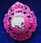 The brooches on display are to my mind, an intriguing combination of the Dutch tradition of Vanitas and Victorian mourning jewelry. Singer has worked in wearable art in the past, and these pieces demonstrate that art need not always be relegated to a gallery environment. Where Vanitas, with their skulls and rotting fruit, served as a reminder of mortality, and mourning jewelry has traditionally served as a reminder of a particular lost loved one, these ornate brooches adorned with painted skulls, seem to provide a subtle commentary on the universal transience of life.