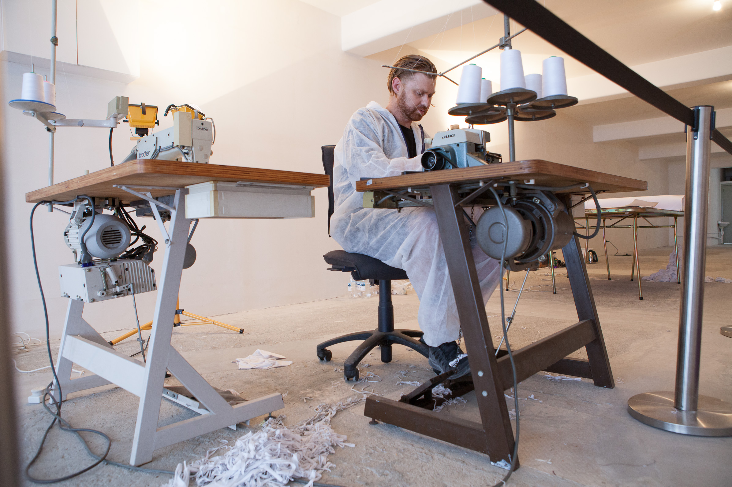 However, graffiti and embroidery sit at opposite ends of the visual arts spectrum and each has deeply embedded connotations. The latter is associated with the feminine, measured and private while the former more so with the masculine, hasty and public. Both are connected with marginalised groups: exploited women in third world countries, and hooded young men trying to find a voice in urban environments. What began as a visual deconstruction of the politics of street art became perceived as a comment on gender stereotypes. Hutchinson reacted to this reading with a series of performances carried out between 2007 and 2015 where he replicated sweat shop conditions, making t-shirts for ten cents an hour. In doing so, his work took on new political intent gleaned from Marxist theory, exploring how time and labour are valued in a society driven by capitalism.[9] Over this period he continued to make embroidery based works with an autographical bent. One of these, Loosely Based on a Series of Events that Never Actually Happened (A Gallery, Dunedin, 2012), recounted his teenage years through embroidered doodles on classic Warwick notebooks and crumpled paper. Reproduced in silk, these sat inside an old wooden school desk emblazoned with inflammatory text and drawings by bored high schoolers. This installation was an important step for Hutchinson, who began to explore how the context of presentation could encourage viewers’ to consider his embroidery practice as something other than a comment on gender stereotypes.