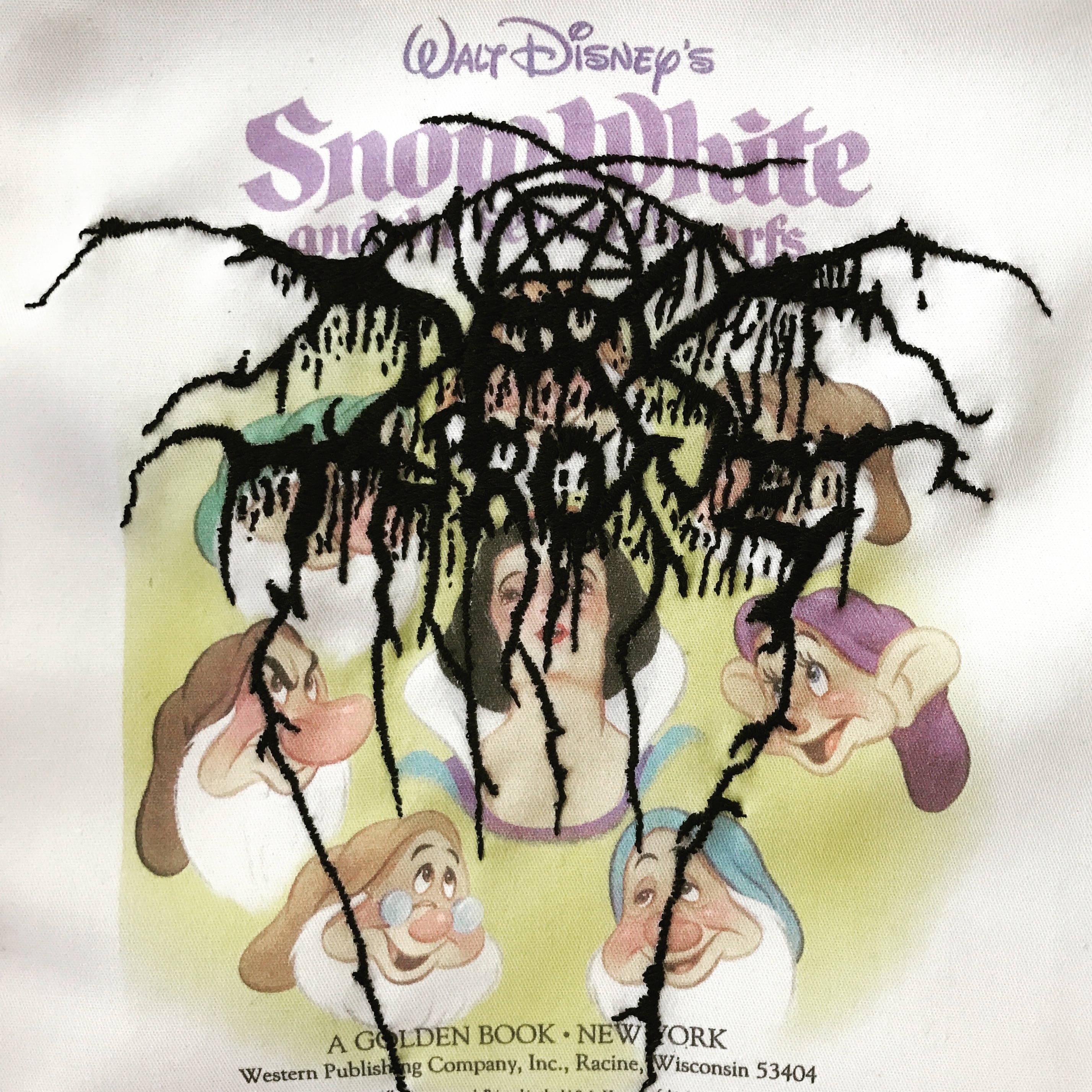 While completing his Master of Fine Arts, Hutchinson began to explore the politics and perceptions of this subculture. An experienced tagger, he was interested in the unwritten laws that determined who could tag where, and when it was acceptable to write over others’ work. He translated the designs and texts that resulted from these rules—illegal marks, ugly to the untrained eye—into delicate embroideries. In his breakthrough exhibition From Concrete to Textile (Blue Oyster Art Project Space, 2006), Hutchinson explored the theories of Walter Benjamin and asked his audience to consider how and when copies become originals. He presented six embroidered, stretched canvases that were manipulated and stained to resemble street textures such as stone, wood and concrete.[8] The harsh, tagged lines were recreated with luminous cotton and lifted out of their natural habitat onto clean, white gallery walls. Positioned outside of the marks’ usual context, these pieces became an investigation of formal qualities, appreciated for the skill associated with embroidery.